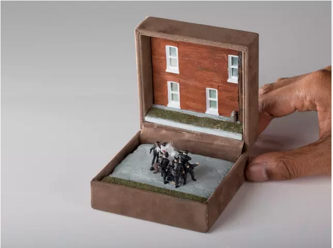 而Talwst在制作這些場(chǎng)景事會(huì)根據(jù)一些事件來(lái)做,將他們記錄下來(lái)。他作為有色人種,特別關(guān)注種族歧視和殖民主義相關(guān)的事件,因?yàn)樽约壕驮驗(yàn)榭雌饋?lái)“可疑”被警察盤問(wèn),所以深有感觸。他有兩個(gè)知名作品就是根據(jù)2014年發(fā)生在美國(guó)的邁克爾·布朗命案和埃里克·加納死亡案進(jìn)行的創(chuàng)作。