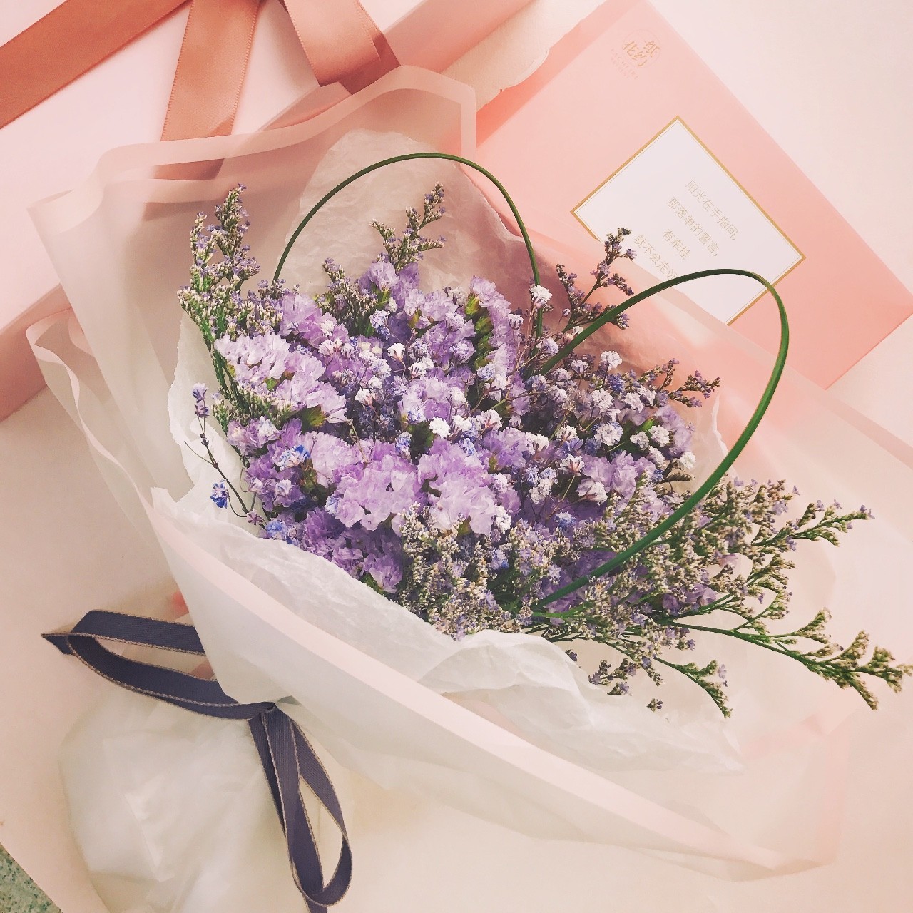 如上圖,小編的這束花的特別之處在于在束花里加了鋼絲草,做成了愛心的造型。在這個表達愛意的節(jié)日里,當然要無處不在的比心心以表誠意啊~